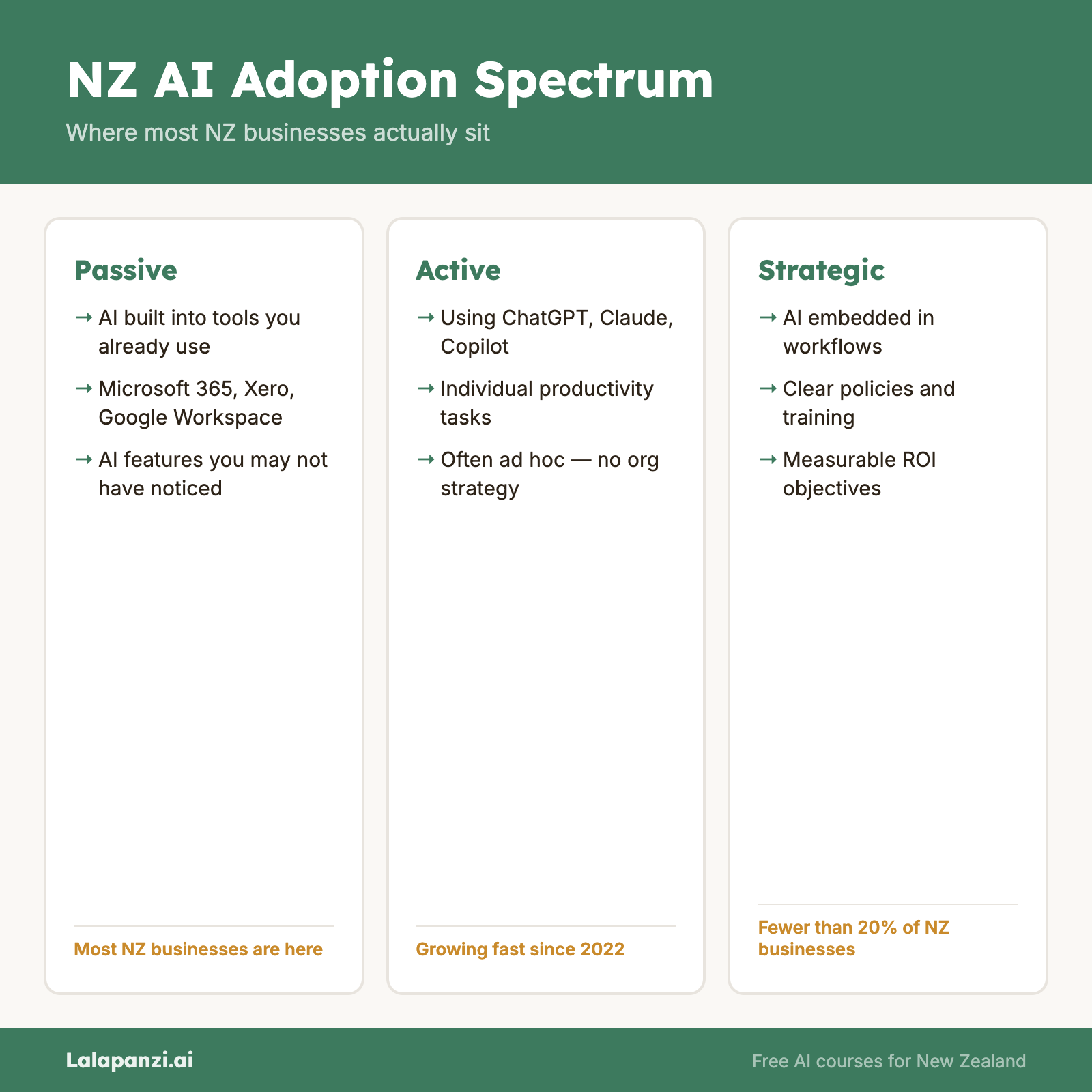 Passive adoption — using AI features built into tools you already have. If you use Microsoft 365, Google Workspace, or Xero, you're already using AI whether you realise it or not. Spell-check, smart replies, automated categorisation, fraud detection — these are all AI features embedded in everyday business tools. Most NZ businesses are here.