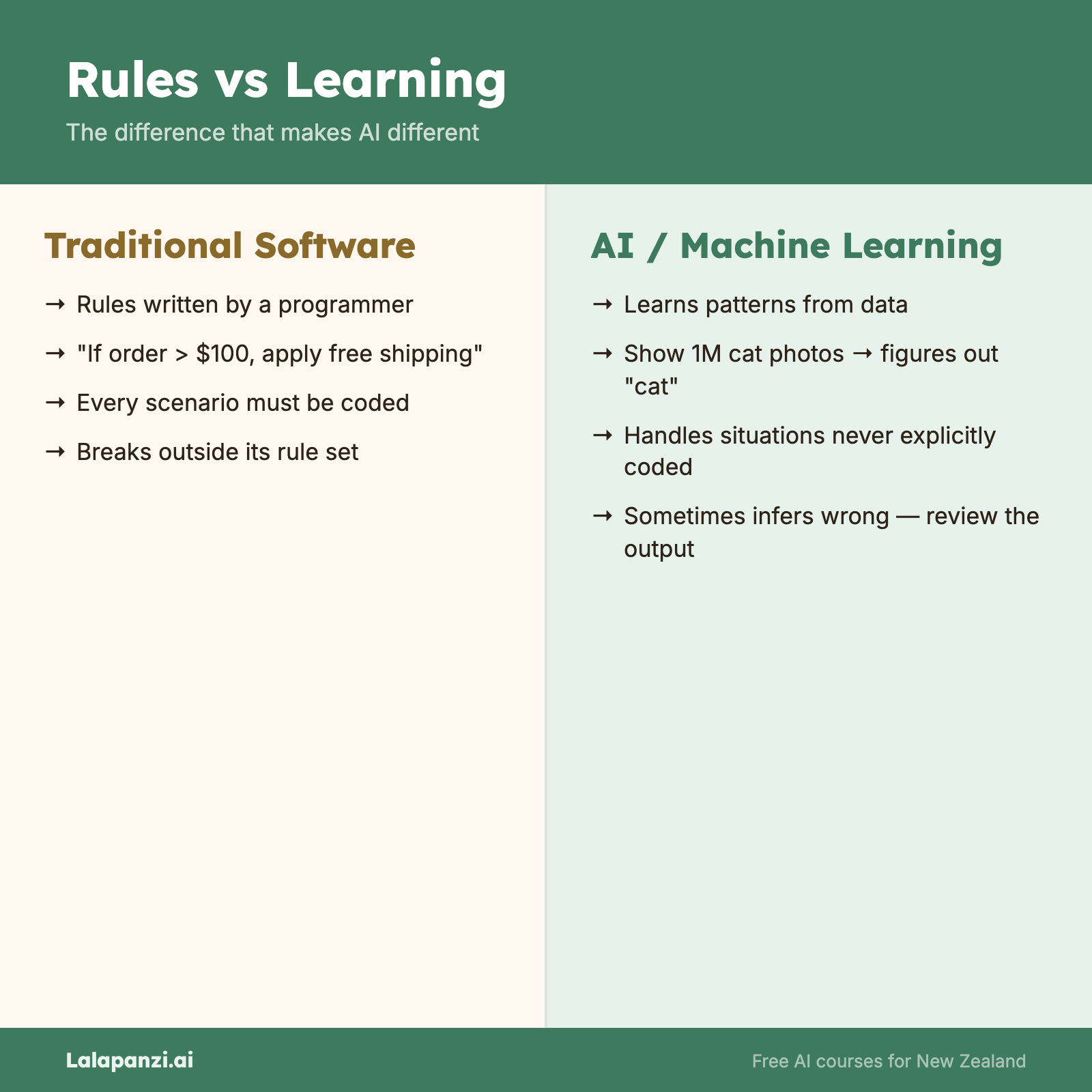 Traditional software follows rules that a programmer writes out explicitly. "If the customer's order is over $100, apply free shipping." Every scenario has to be anticipated and coded for.