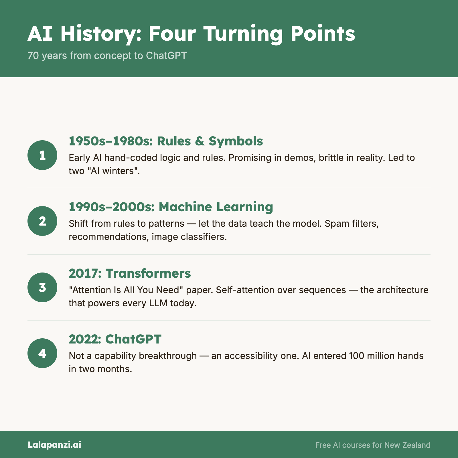 You don't need to memorise dates to use AI well. But understanding where this technology came from helps you see the current moment clearly. AI isn't a sudden invention — it's the result of seventy years of work, false starts, breakthroughs, and a few lucky timing coincidences.