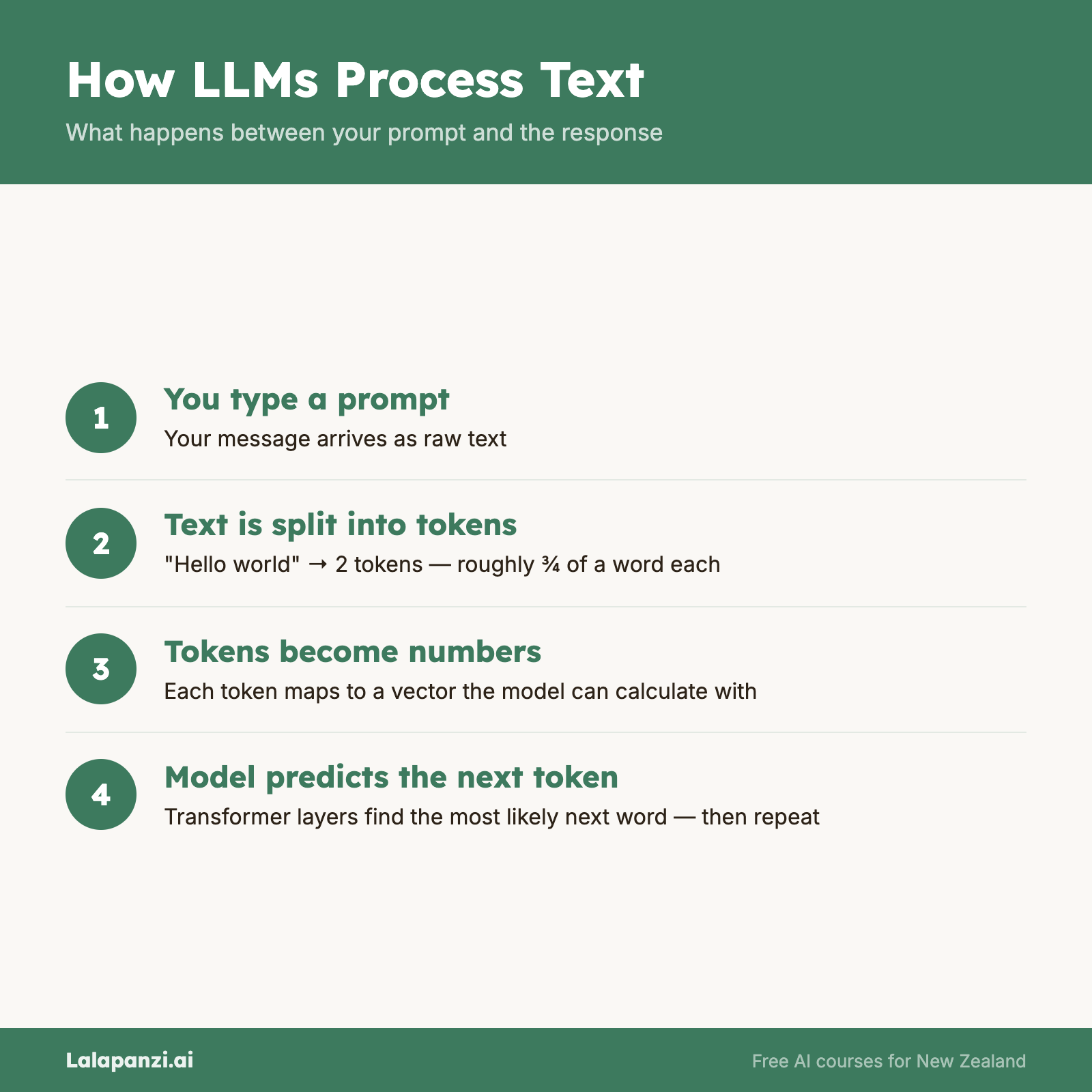 Why does this matter? Because the model doesn't see your message as words with meaning. It sees a sequence of numbers representing text fragments. Everything that follows is mathematical operations on those numbers.