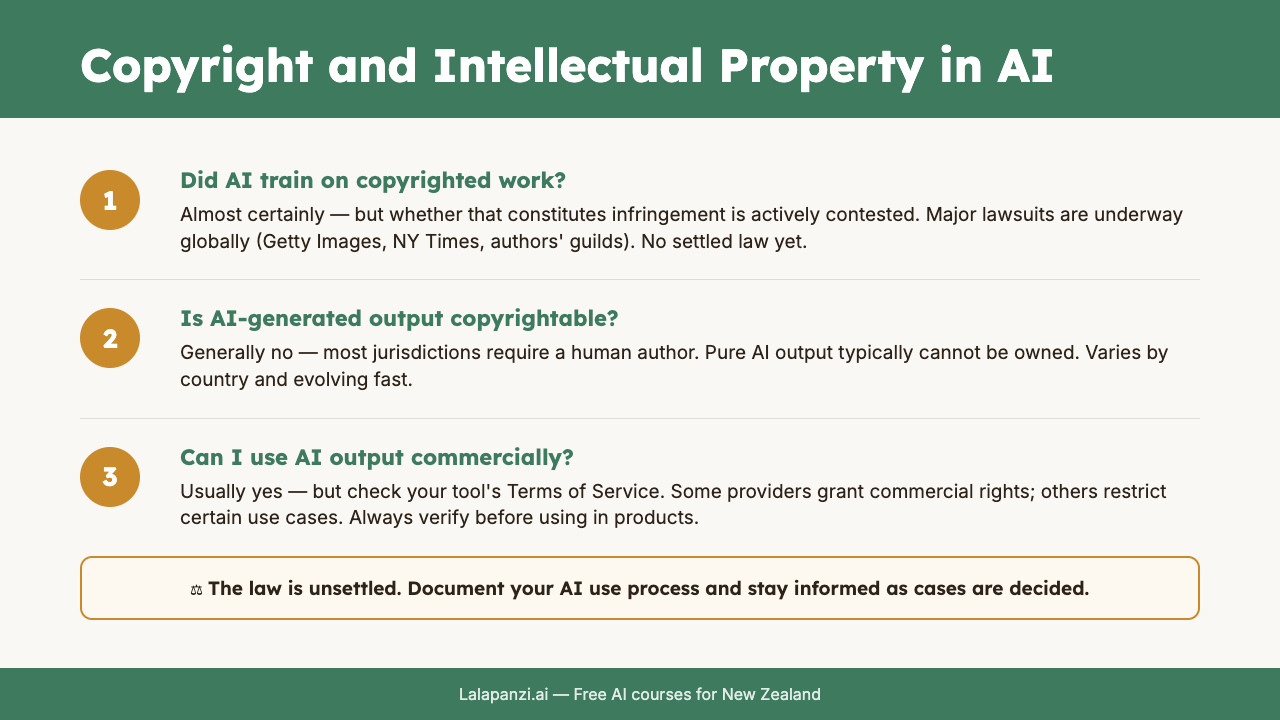 AI has created a genuinely new set of questions around copyright and intellectual property (IP). Who owns what an AI generates? Can you use AI-generated content commercially? What about the data AI was trained on — did anyone get permission to use it? These questions don't have simple answers yet, but understanding the landscape will help you make better decisions about how you use AI in your work.