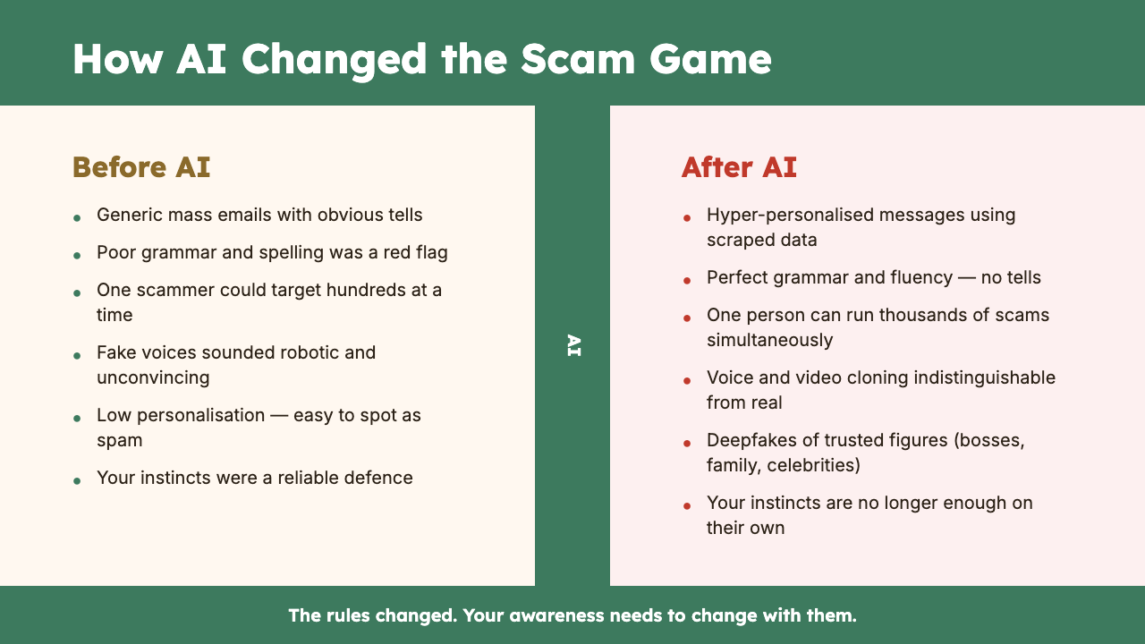 AI has eliminated nearly all of these. A scam email today can read as naturally as a message from your bank. It can address you by name, reference your suburb, mention recent events, and be formatted perfectly. There is nothing left to catch your eye.