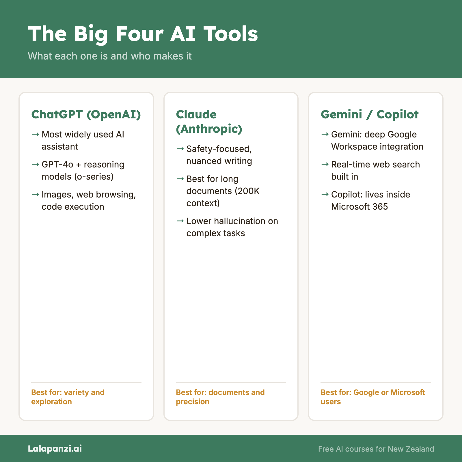 While the big four remain essential, Q1 2026 saw the rise of specialized AI tools for specific New Zealand industries. Notable examples include AI-assisted farm management platforms like PastureAI and StockSense, healthcare diagnostics helpers such as MediScan NZ, and compliance tools tailored to NZ regulations like ComplyChain. These tools often build on the big four models but offer domain-specific workflows. For an overview of emerging consumer-facing AI features, see the AI Essentials course.