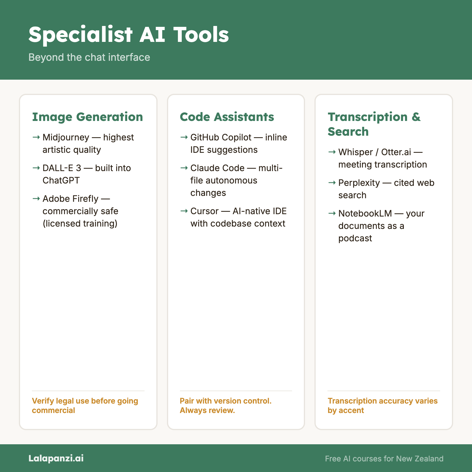 This lesson covers the major categories of specialist AI tools: what they do, when to use them, and which ones are worth knowing about.