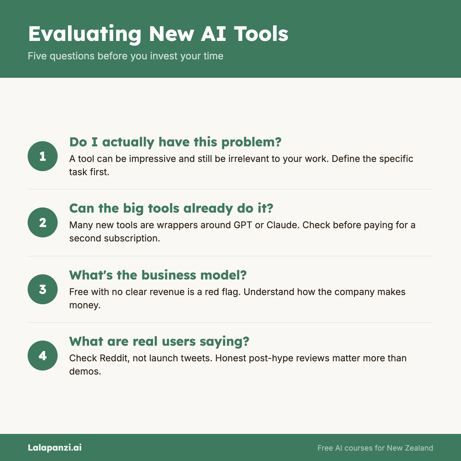When you hear about a new AI tool, run through these five questions before investing your time.