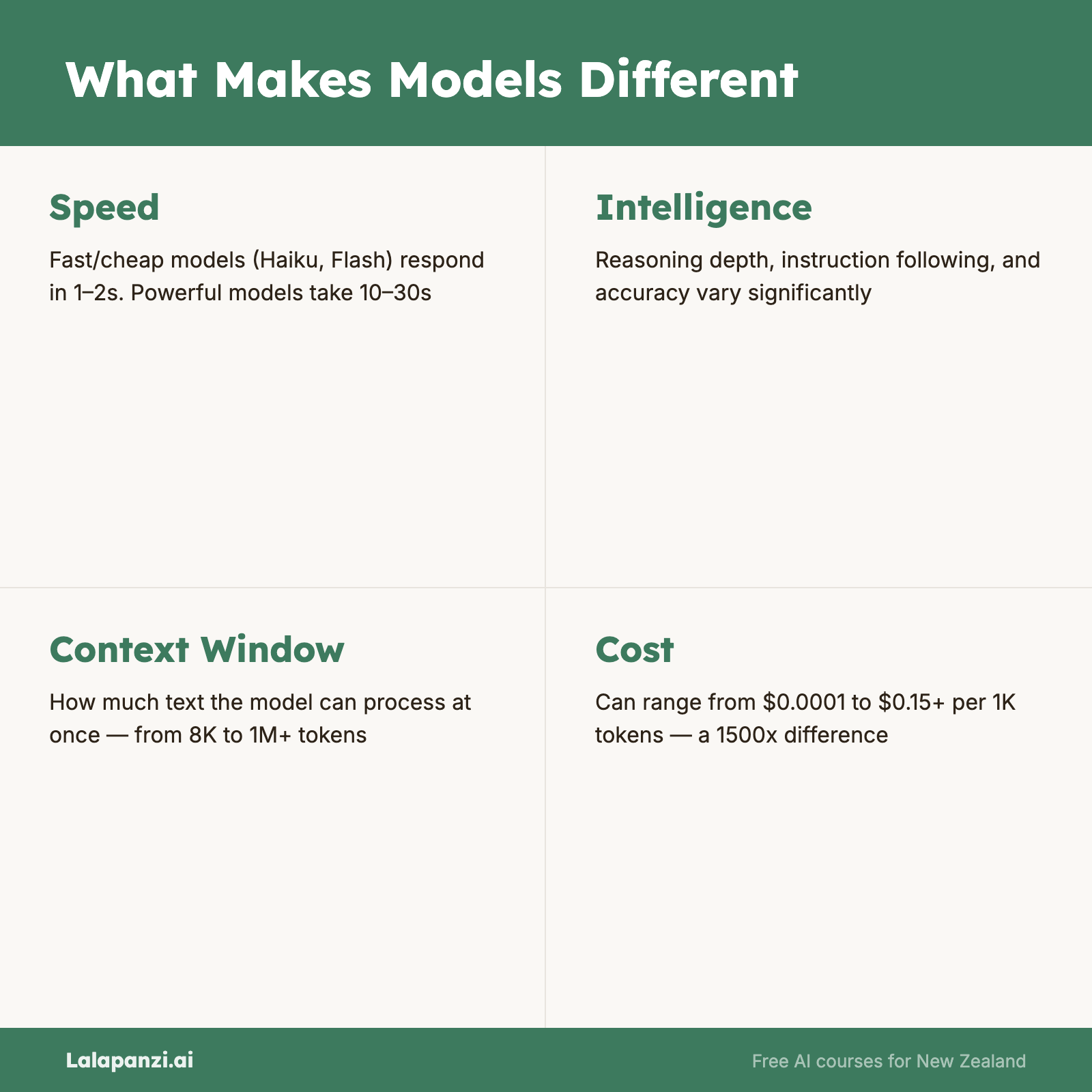 It comes down to five key dimensions. Understanding these will give you a practical framework for choosing the right model — not just now, but as new models appear (and they appear constantly).
