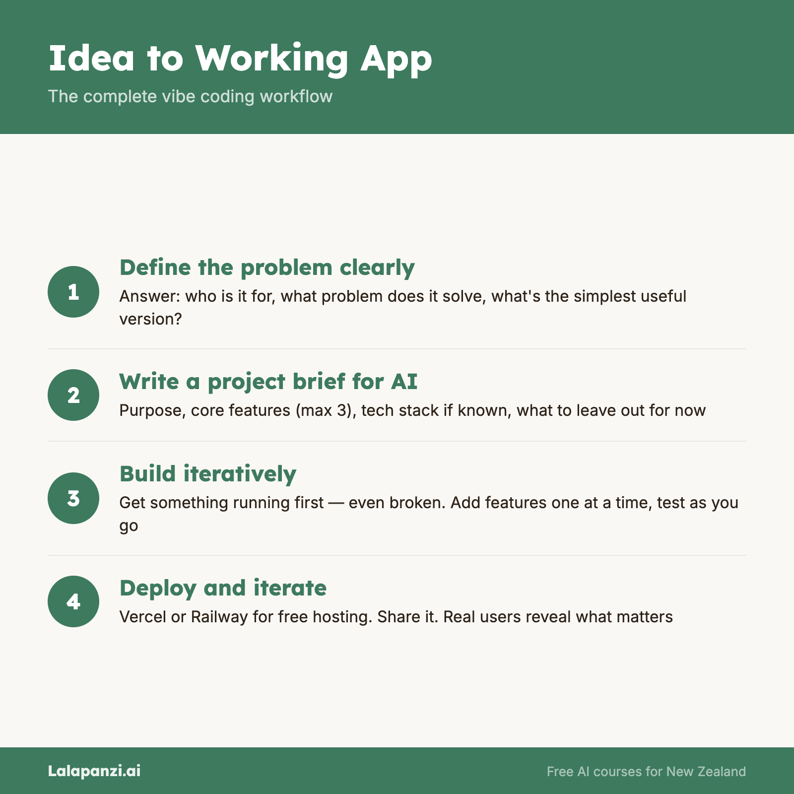 Document what you build. Keep a simple note — what the app does, what AI tool you used, any quirks or things to remember. Future you will be grateful.